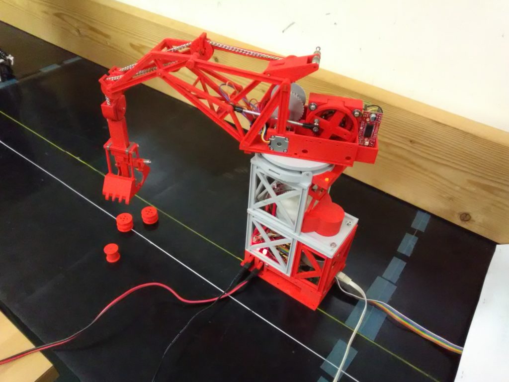 工学部大学生向けのメカトロ・IoT教材の展示 P1000188 西部プラン ラズパイにwebカメラやセンサ・モータを接続してPCからブラウザで遠隔監視制御を行うIoT演習向けの教材の1つとしてダブルリンクグラブバケットクレーン模型を展示します。純粋に操作を楽しむクレーンゲームで遊んでください。またCADと3Dプリンタ操作の練習で作った鉄道用連結器の可動模型や立体パズルの展示販売を予定しています。 P1000189 P1000121